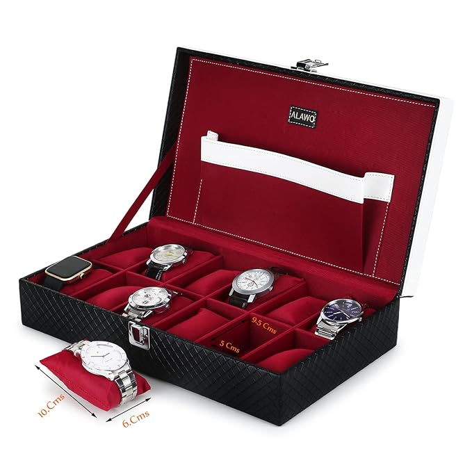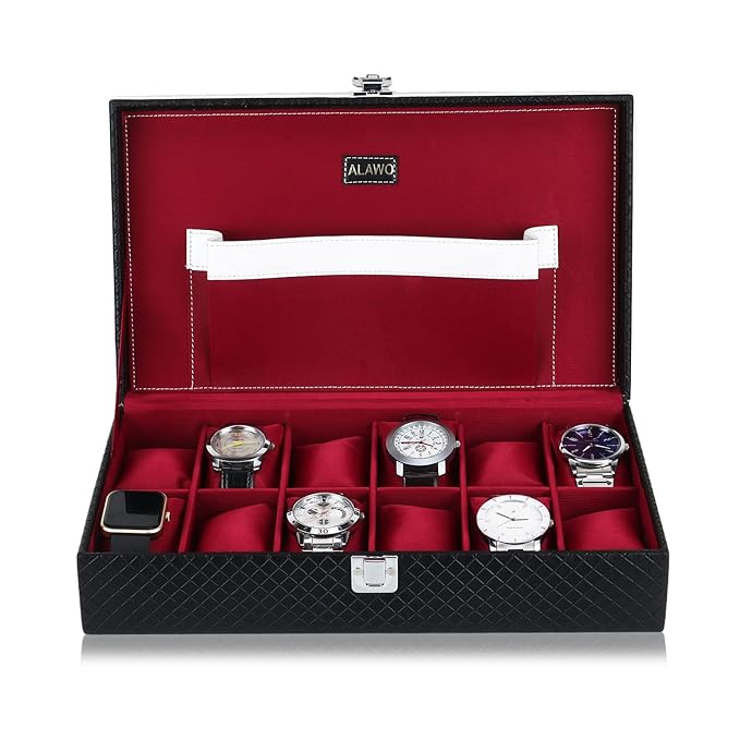 ALAWO Watch Case Organizer Box – 12 Slots (Black PU Leather, Cherry Velvet)